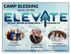 Youth Camp is held every summer in mid-July. At Camp Blessing your child will find his or her place! We offer Day Camp activities from 9AM-3PM for ages 4-7. Day Camp features fun crafts and activities, a Bible hour filled with interactive stories and games, lunch time, and snow cones! Also we operate a Junior Camp and Teen Camp during this week. At these camps your child will stay on the campgrounds from registration on Monday until dismissal on Friday. Each day they are afforded the opportunity to have a life changing experience in church services in the morning and evening. They will also be able to make lasting friendships with their peers during our sporting events, team activities, and free time! For more information please call (440) 233-8575!